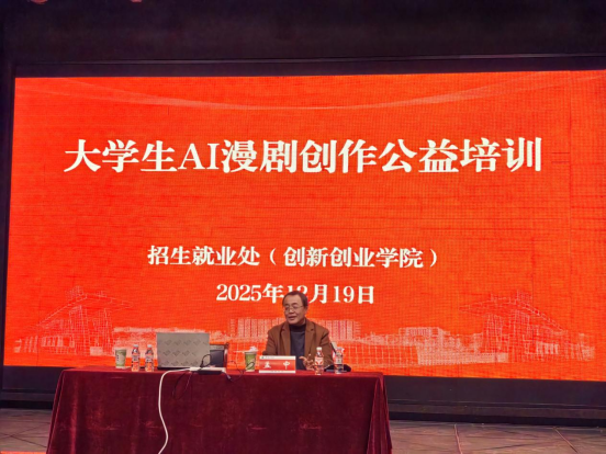 12月19日下午,由创新创业学院与平顶山数字经济产业园共同组织的“大学生AI漫剧创作公益培训”在图书馆T610举行。北京电影学院文学系副教授、中国电影家协会编剧教育工作委员会副会长兼秘书长孟中教授应邀主讲,围绕人工智能技术在内容创作中的前沿应用进行分享。招生就业处副处长(创新创业学院副院长)王翠英、大学生创新创业协会、大学生职业生涯发展协会、鹰翔众创空间企业代表及各二级学院师生代表参加了本次活动。